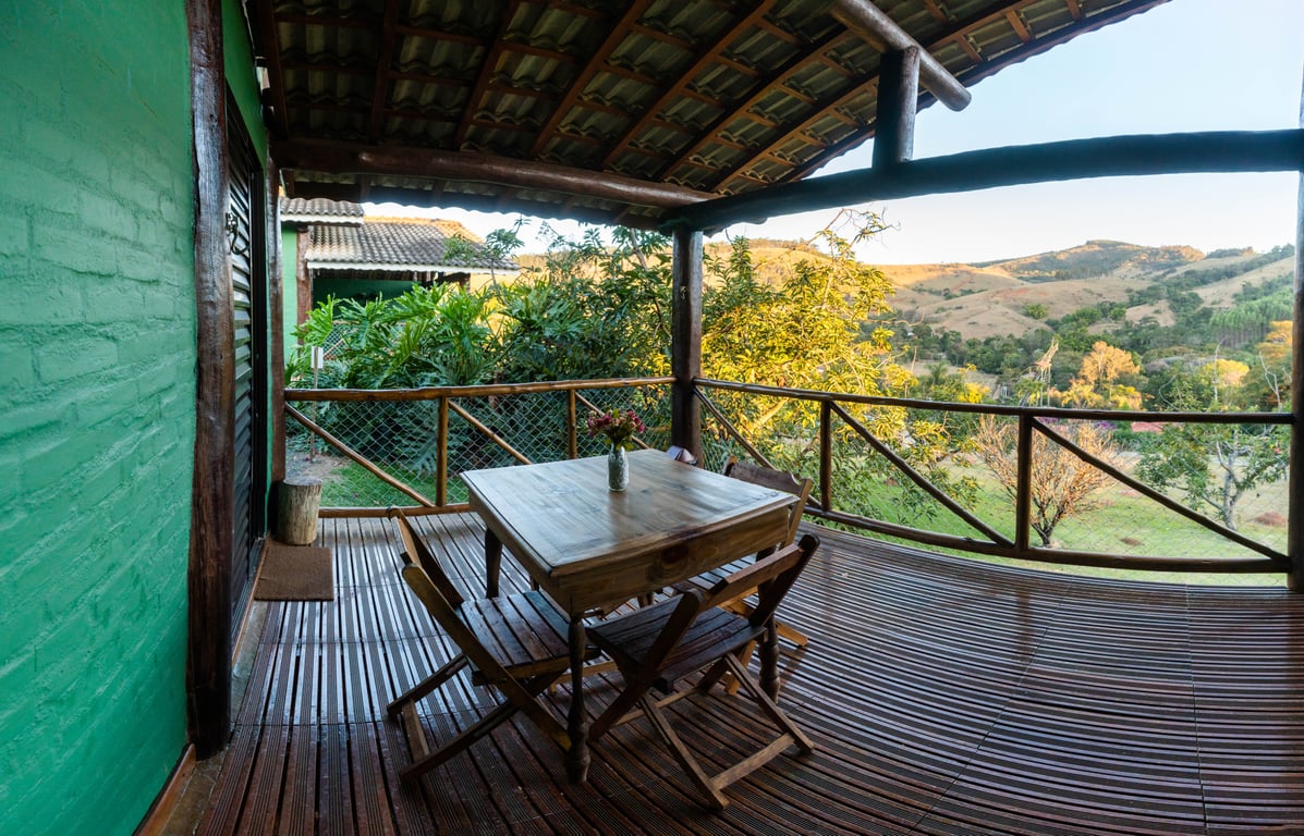Chalé rústico, que acomoda até 05 pessoas. Possuem um deck amplo, com vista panorâmica as montanhas e área da piscina, onde é possível apreciar um exuberante show no fim de tarde com o colorido do céu e a passagem das garças. O chalé dispõe de cama Queen, mezanino, banheiro privativo com chuveiro a gás, deck de madeira com vista para as montanhas, mesa e rede para descanso, ar condicionado, lareira, frigobar, microondas, televisão tela plana, secador de cabelos, roupa cama e banho, estacionamento, wi-fi.