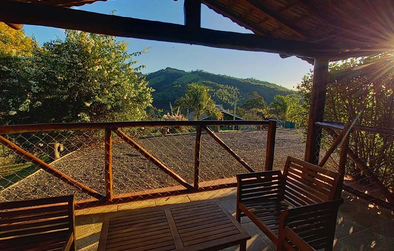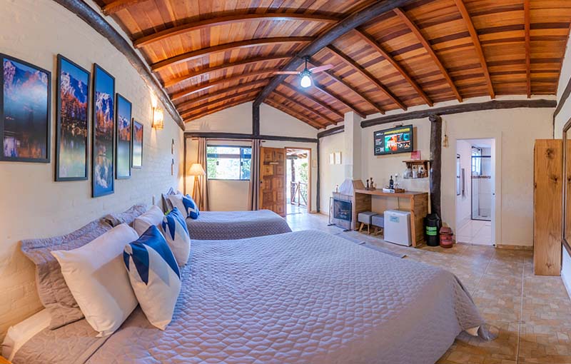 Chalé rústico, que acomoda até 05 pessoas. Possuem uma varanda térrea, com vista panorâmica para as todo o vale do Rio do Peixe. O chalé dispõe de cama Queen, banheiro privativo com chuveiro a gás, varanda com mesa e rede para descanso, ventilador de teto, lareira, frigobar, microondas, SMART TV, secador de cabelos, roupa cama e banho, estacionamento, wi-fi.